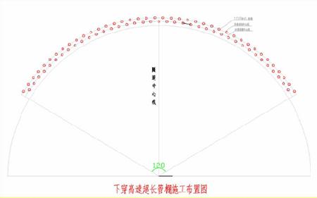 大方隧道下穿杭瑞高速公路,下穿段采用CRD法施工,控制爆破開挖。本下穿地段屬融蝕峰叢洼地及剝蝕低丘地貌,丘包低緩,存在溶洞。管棚采用有線導向監測,楔形板糾偏水循環鉆進工藝。結合現場施工及水文地質情況,決定在該下穿段設一環?108mm雙層大管棚,分別在下穿隧道開挖線輪廓線外側0.2m(內排)和0.4m(外排)布置管棚入口,梅花形布置;每根管棚長為40m,管棚中至中間距0.4m,共80根,單孔打設長度80米;管棚鋼管壁厚6mm,環向設置為拱墻120°范圍。